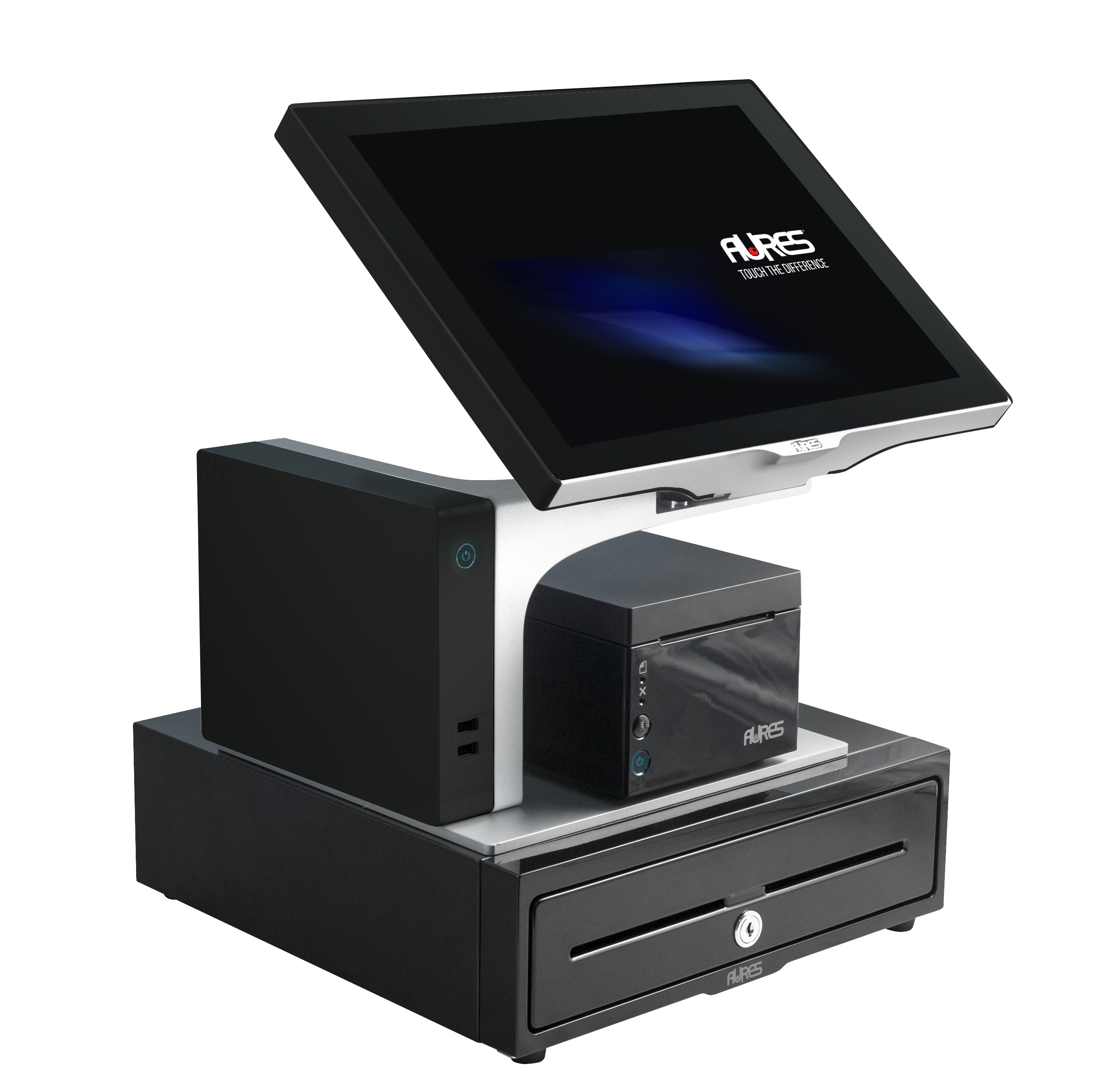 With its elegant shiny “black piano” front side and its small dimensions (335 x 110 x 350mm), the peripheral creates the perfect match with any 15 inch EPOS system or touchscreen, especially the SANGO and the YUNO terminals for example, combining aesthetics, usefulness and efficiency to fit within all Retail and POS environments.